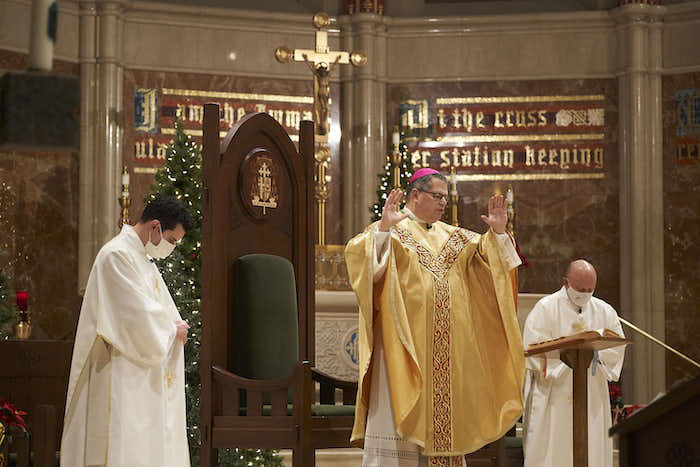 Bishop Douglas J. Lucia offers a blessing at the close of the Christmas Mass pre-recorded for television Dec. 15. (Sun photo | Chuck Wainwright)