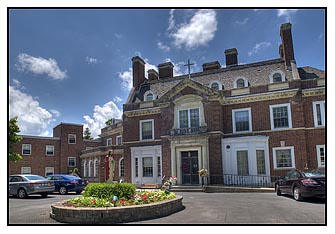 Beautifully-landscaped, spacious grounds surrounding the building include 32 memorial gardens. An Olympic-sized swimming pool is also part of the landscape. A pond is situated opposite the swimming pool. The bricks surrounding the pond were purchased by people in memory of their loved ones. Colored flowers are interspersed throughout the grounds. There is a wooded area on the property that offers a stunning view of the nearby hills. Also included on the grounds are the All Saints Terrace and the Stations of the Cross.
