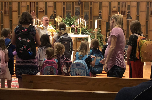 CICERO — Sacred Heart Church held a potluck dinner, Holy Hour, and backpack blessing for students Sept. 3. Here, Sacred Heart pastor Father Richard Prior offers the blessing. — Photo courtesy Deacon Ken Money
