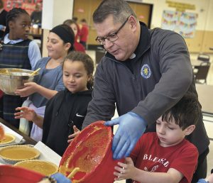 On Monday, Nov. 24, Blessed Sacrament School in Syracuse continued its long-standing annual tradition (26 years!) of making pumpkin pies to donate to the Rescue Mission for Thanksgiving meals. With over 200 pies donated this year, Blessed Sacrament is the number one outsource of pies received by the Rescue Mission for the Thanksgiving holiday. Students in pre-K through sixth grade participated in pie making in the school’s cafeteria, with fifth-grade students helping the Tiny Eagles and sixth-grade students helping the pre-K students. Each student receives a bowl and proceeds through the various ingredient stations to get their pumpkin pie ready for pouring into the pie shell. The students’ excitement is evident as they move from station to station, knowing that they are creating something for those in need. The students were joined by parent volunteers, school alumni, Dr. Amy Sansone, Bishop Douglas J. Lucia, and Father Severine, all of whom helped in the pie-making process. This project is a hands-on lesson in gratitude, generosity, and serving others.