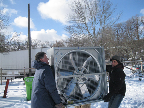 Volunteer Tony Ortega, left, and Kevin Frank, executive director of the Brady Faith Center, carry a fan that will be installed in the new greenhouse — Tunnel 3 — at Brady Farm.