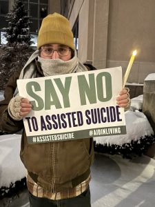 Honks from cars, followed quickly by cheers and raised candles, rang out across the road as those driving by read the large sign held by the crowd. In large black and white font, it read “No Assisted Suicide.” Over 60 people came out in the cold.