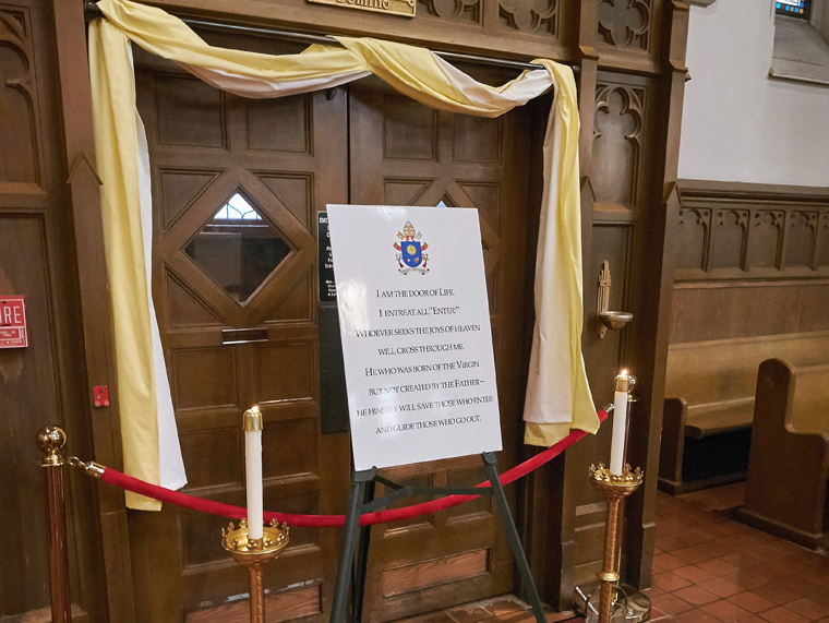 The door, located at the front right of the Cathedral, was hung with bunting in papal yellow and white and flanked by candles. Msgr. Neal Quartier, rector of the Cathedral, celebrated the sealing rite at the beginning of the 9:45 a.m. Mass.