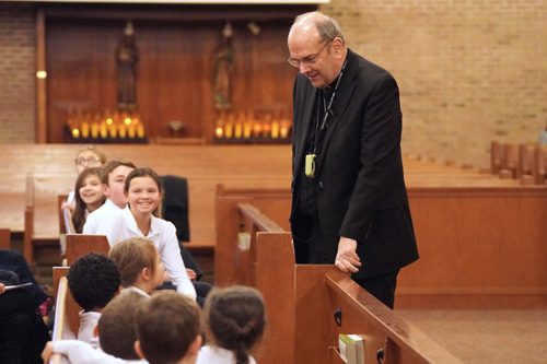 Bishop Robert J. Cunningham visited Trinity Catholic School in Oswego for a prayer service and vocation talk (above). (Sun photos | Chuck Wainwright)