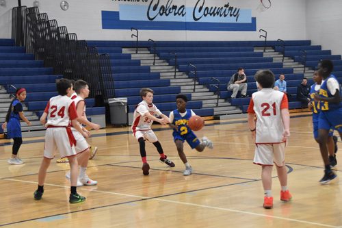 Bishop Grimes Jr./Sr. High School played host to basketball teams from Holy Cross, Cathedral Academy at Pompei, and Holy Family Jan. 27; a similar day of games had previously been hosted at Christian Brothers Academy. Since many of the young players will likely attend Grimes or CBA one day, “I wanted them to get an experience, more than anything, at their future prospective schools,” said PJ Herron, physical education teacher and athletic director for Holy Cross School, who organized the day. “So far I feel like they love it.” Above, CAP and Holy Cross face off; Holy Cross won the close game, 41 to 39. (Sun photo | Katherine Long)