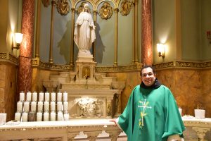 Father Nader Ata, OFM Conv., associate pastor of Assumption Church stands before a beautiful side altar in the spacious church.