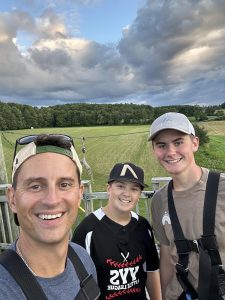 Rev. Christopher Ballard, students Nolan Crumb and Charlie Martin at The Root Farm ropes course for the July 2024 Totus Tuus evening program outing. Photo received 1.7 thousand interactions on Facebook.