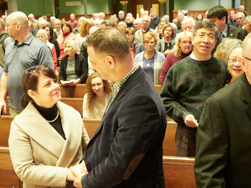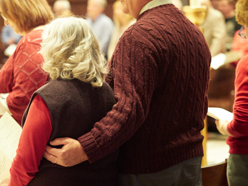 Mary and Mark Meier, parishioners of the Church of the Holy Family in Endwell marking 33 years of marriage, exchange smiles at the Mass. The couples were among dozens who attended the annual Mass at the Cathedral.