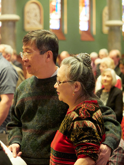 Richard and Sally Bowers, parishioners of St. Mary-St. Paul in Binghamton marking 59 years of marriage, attended the Mass along with their daughter and son-in-law, Mary and Mark Meier. Mary and Mark attend the Church of the Holy Family in Endwell and are marking 33 years of marriage. Mary said she learned commitment from the example of her parents’ marriage, and both she and Mark agreed that the key to a lasting marriage is “putting each other first.” Richard offered his wisdom as well, noting patience as the key.
