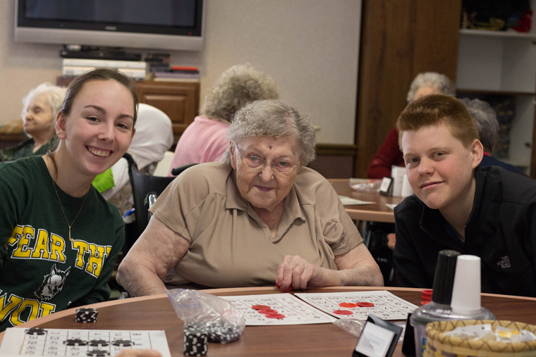 Pictured above, HCA senior Gabby Nowakowski, ECF resident Gertrude Dixon and HCA senior Greg van Lieshout enjoy a game of bingo.