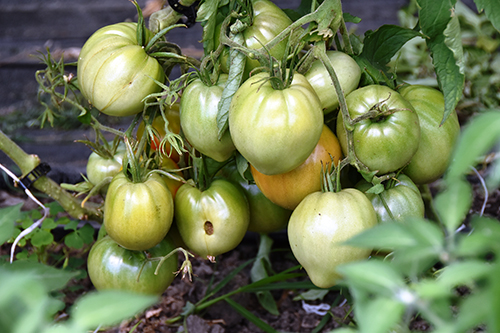 Other things that were coming on, she said, were “tomatoes and cherry tomatoes; the peppers are starting to color up. The hot peppers have been amazingly productive inside of the tunnel. Cucumbers we’ve had probably for the last two months at least but they’re still coming on. We’ve been picking green beans; they picked some carrots this week [in late July], lettuce, herbs of all kinds — basils and dill. … Onions, of course! We have so many onions and garlic.”