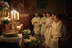 Priests, deacons, and servers pray before the Blessed Sacrament at the Colgate University chapel following Holy Thursday Mass at St. Mary’s in Hamilton March 29, 2018. (Sun photo | Chuck Wainwright)