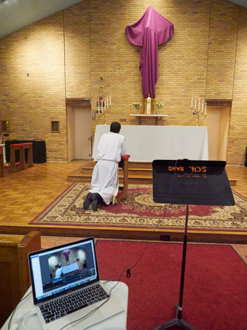Father Jason Hage, pastor of St. Mary in Hamilton and St. Joan of Arc in Morrisville, sat near his computer, positioned at the edge of the sanctuary, to deliver his Easter homily.