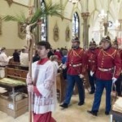 “Certainly our prayers for each one of you and for all our sisters and brothers who these days struggle with the COVID-19 pandemic,” said Bishop Lucia, dressed in red vestments symbolizing Jesus’ blood. “We especially pray for those who are nearest to those undergoing this passion: our doctors, all in health care, along with those who serve our community in different ways. We pray for them that the Lord will continue to give them strength. We pray the Lord will bring healing to those who are ill, comfort to their families. And to those who have died eternal; repose and consolation to their families.”
