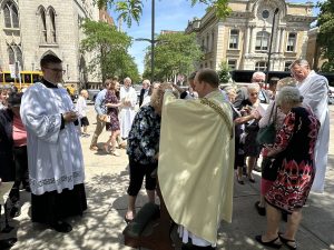 Fr. Pawel stands outside the Cathedral of the Immaculate Conception offering a first blessing after his ordination on June 1. (Sun photos l Chuck Wainwright)