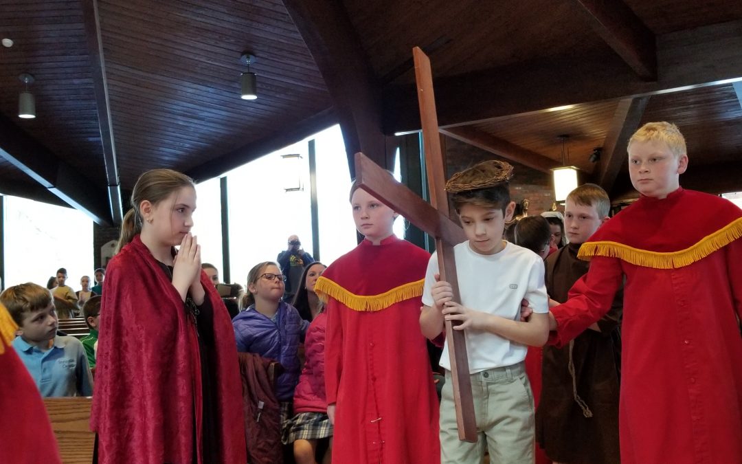 FAYETTEVILLE — The fourth grade class of Janet Kirkgasser and Doreen Conrad re-enacted the Passion of Christ March 26. The play depicts the suffering and final hours of Jesus’ life, beginning with the Last Supper with the disciples, the agony in the Garden of Gethsemane, the betrayal by Judas, his crucifixion on Mount Calvary, the grief of the Blessed Virgin Mary, and ending with his Resurrection.