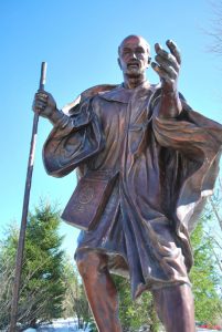 A statue of St. Ignatius Loyola, the founder of the Society of Jesus, stands near Le Moyne’s Panasci Family Chapel. The bronze statue, commissioned in 2015, depicts St. Ignatius venturing into the world. People associated with Jesuit colleges like Le Moyne often cite a quote attributed to St. Ignatius: “Go set the world on fire.” (Archive photo courtesy Le Moyne College)