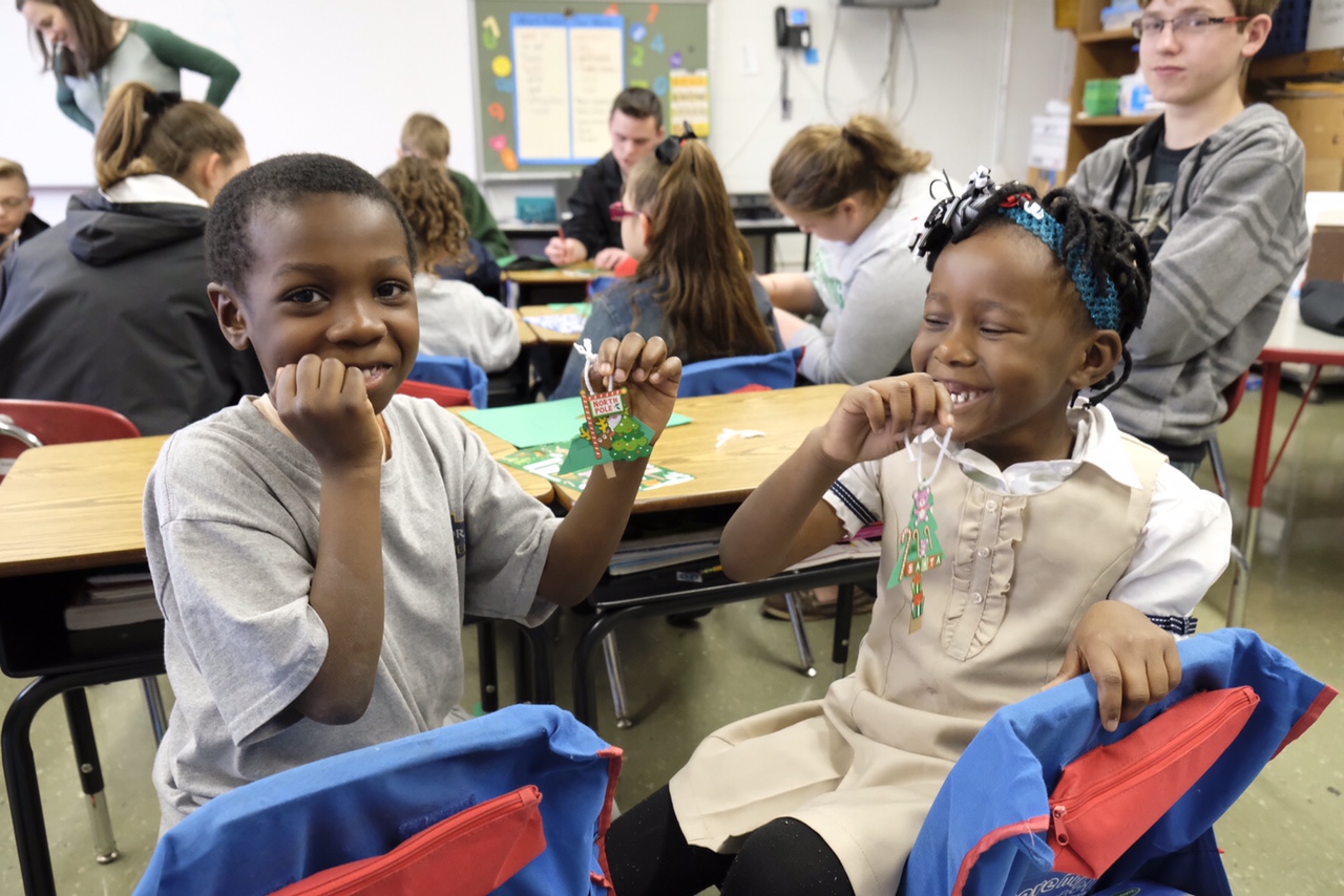 The spirit of Christmas shone brightly Dec. 1 as freshmen from Bishop Ludden Jr./Sr. High School visited the elementary students at Cathedral Academy at Pompei to work on a service project together.