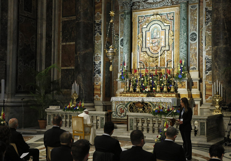 The pope and about 160 young adults and families from Rome prayed in St. Peter’s Basilica and were joined remotely by people at the National Shrine and Basilica of Our Lady of Walsingham in England, the first of 30 Marian shrines around the world that will lead the rosary every day throughout May.