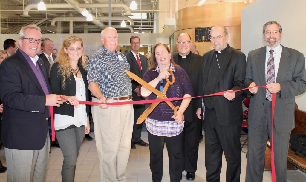 Cutting the ribbon at Catholic Charities of Oswego County’s new location Nov. 3 are (from left) Joseph Slavik, retired director of Catholic Charities, Diocese of Syracuse; Nicole Greenier, program director, The Cornerstone Club adult day services; Steve Frawley, board president, Catholic Charities of Oswego County; Mary-Margaret Pezzella-Pekow, executive director, Catholic Charities of Oswego County; Father Joseph Scardella, pastor, Holy Trinity Church, Fulton; Most. Rev. Robert J. Cunningham, Bishop of the Diocese of Syracuse; and Mike Melara, interim director of Catholic Charities, Diocese of Syracuse and executive director, Catholic Charities of Onondaga County. (Photo courtesy Stephen Chirello)