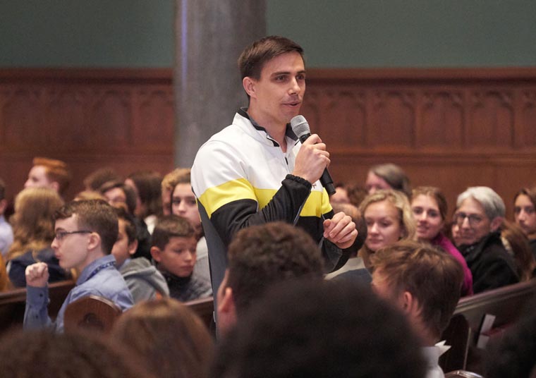 He thrilled the big crowd of high school students, though, with clips from the TV show and with two or three backflips right there in the cathedral. “David danced in ecstasy before the Lord [2 Samuel 6:14],” he noted.