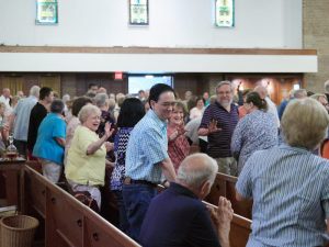Parishioners exchange greetings during the first weekend liturgy of Christ the Good Shepherd Parish in Oswego July 6. (Sun photo | Chuck Wainwright)