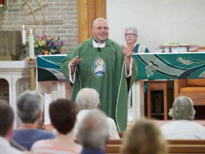 Father John Canorro offers his homily at the first weekend liturgy of Christ the Good Shepherd Parish in Oswego July 6. (Sun photo | Chuck Wainwright)