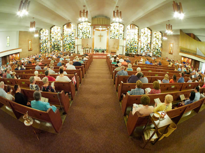 Parishioners exchange greetings during the first weekend liturgy of Christ the Good Shepherd Parish in Oswego July 6. (Sun photo | Chuck Wainwright)