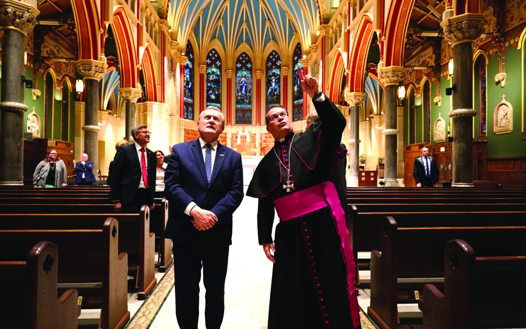 Bishop Douglas J. Lucia welcomed Piotr Gliński and his delegation, conducting a tour of the building. Bishop Emeritus Robert J. Cunningham, Cathedral rector Father Neal E. Quartier, and Father Andrew E. Baranski, pastor of the Basilica of the Sacred Heart of Jesus, also welcomed the visitors.