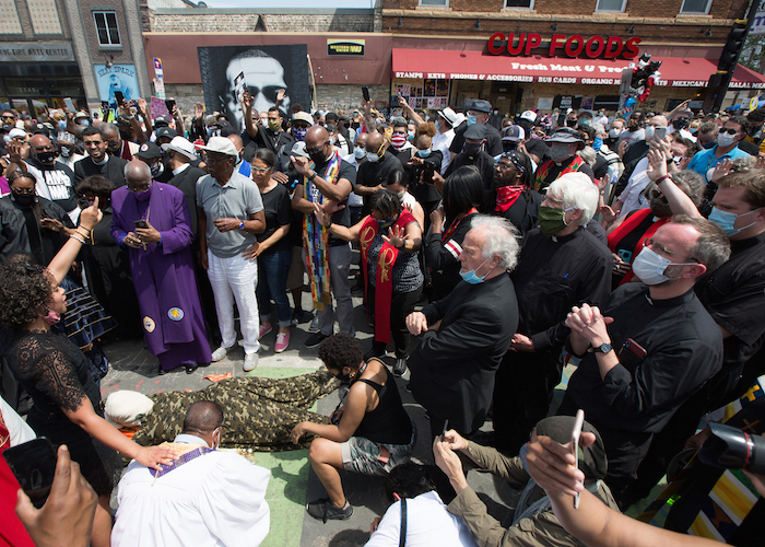 Catholic priests from the Archdiocese of St. Paul and Minneapolis join African American clergy June 2, 2020, to march and pray at the site where George Floyd was pinned down May 25 and died at the hands of a Minneapolis police officer. (CNS photo | Dave Hrbacek, The Catholic Spirit)