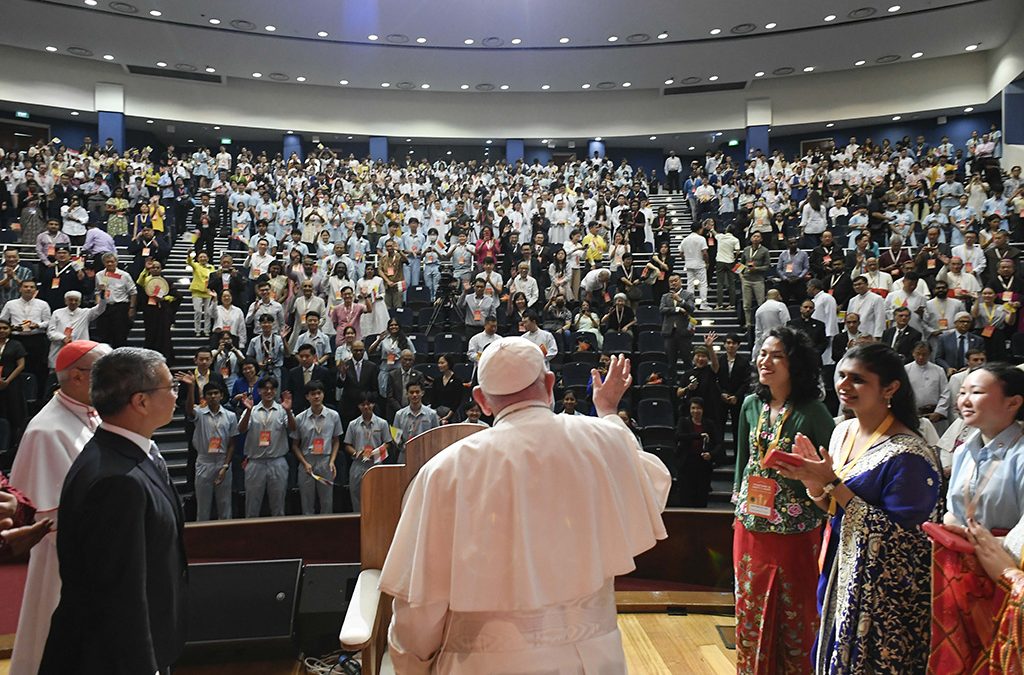 The pope went to the interreligious meeting with young people at the Catholic Junior College after a brief meeting with representatives of Singapore’s priests and religious at the St. Francis Xavier Retreat Center, where he had been staying.