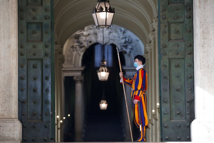 A Swiss Guard stands at a Vatican entrance Nov. 9, 2020, the day before the Vatican released its long-awaited report on ex-Cardinal Theodore McCarrick. (CNS photo | Remo Casilli, Reuters)
