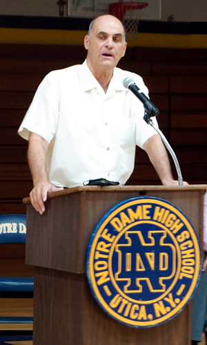 Coach Harry Perretta, retired Villanova women’s basketball coach, speaks on “Shelly Pennefather Day,” Nov. 8, at Notre Dame Jr./Sr. High School in Utica. (Photo courtesy Tom Loughlin Jr.)