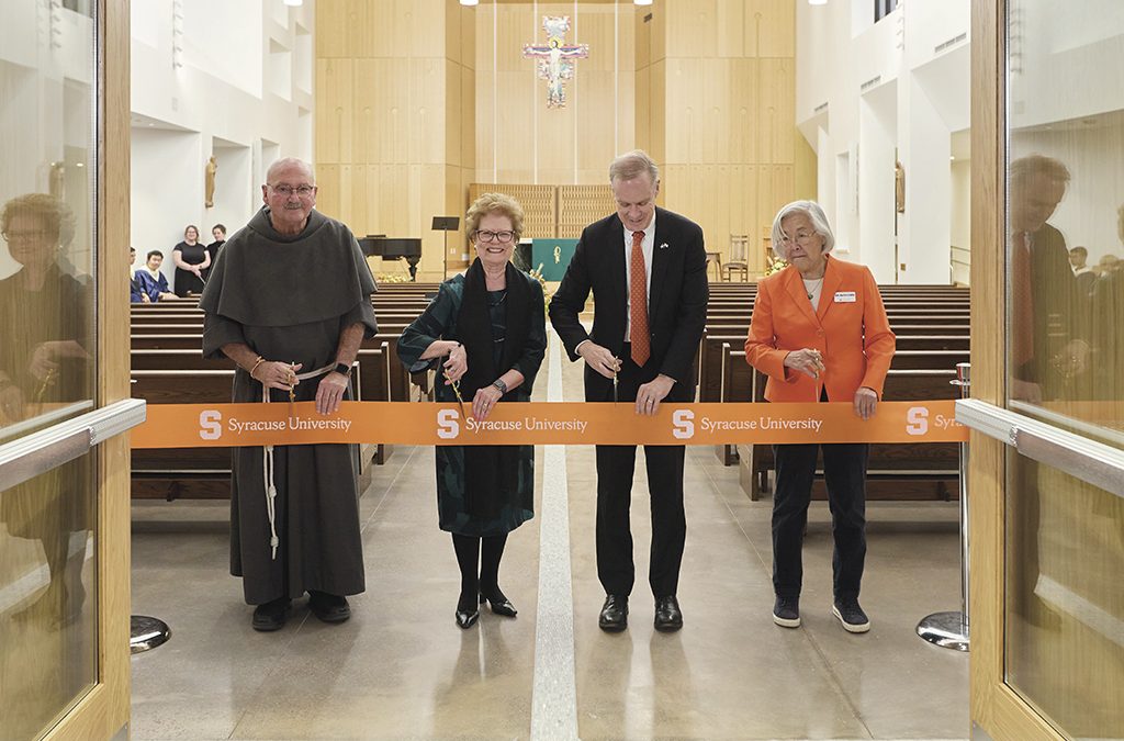 On Nov. 5, Bishop Douglas J. Lucia joined Syracuse University Chancellor Kent Syverud, and Fr. Gerry Waterman, OFM Conv., for the dedication of the new St. Thomas More Chapel and Catholic Center. Franciscan priests, donors, faculty, staff, and students were in attendance to celebrate the newly built chapel located on Walnut Place on the SU campus. In addition to the new church, the renovation includes a new library, which is the former small chapel, and a lounge for comfortable conversation. There are also a number of student meeting rooms for Bible study and a space for the Catholic Student Association.