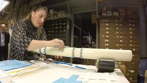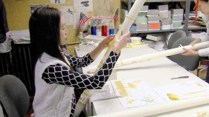 Hieu Nguyen works on an Ornamented Paschal Candle at Cathedral Candle Company in Syracuse. (Image courtesy Richard Mossotti, Syracuse Catholic Television)