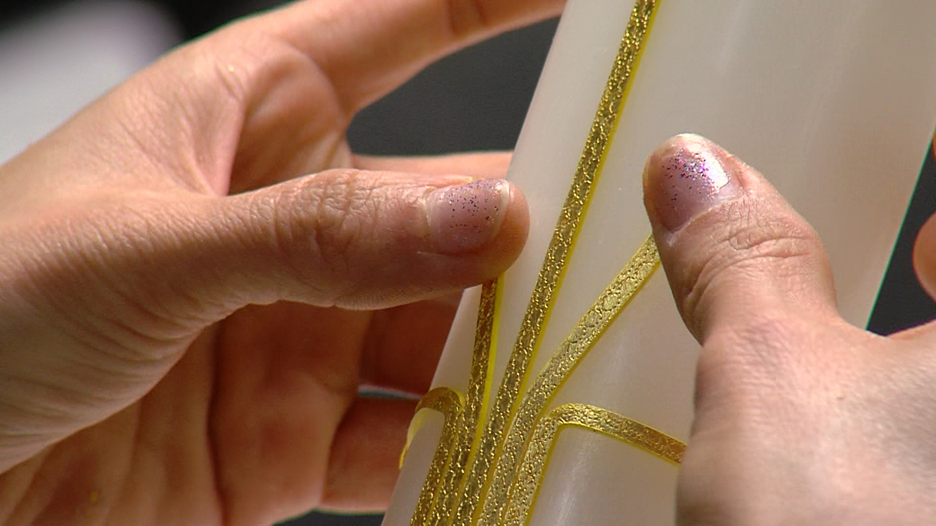 Hieu Nguyen works on an Ornamented Paschal Candle at Cathedral Candle Company in Syracuse. (Image courtesy Richard Mossotti, Syracuse Catholic Television)