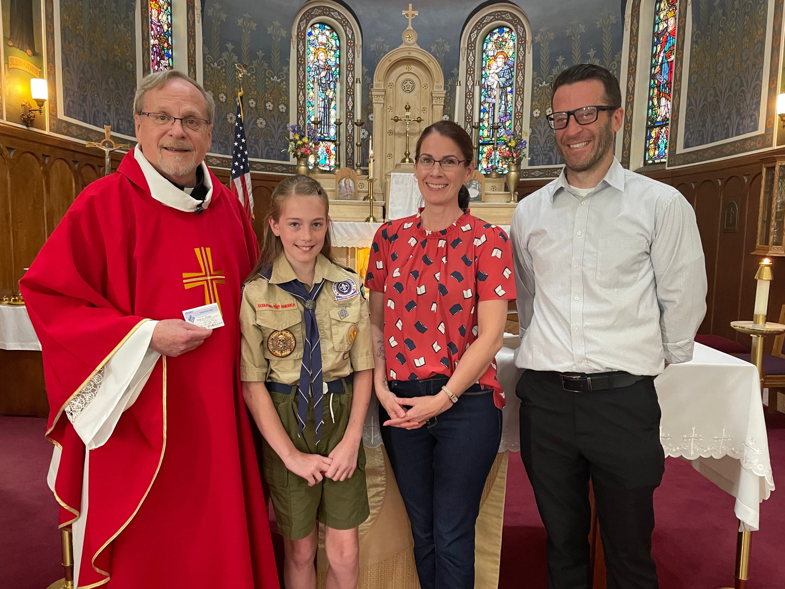 A special occasion took place just before the end of Mass at St. Mary of the Assumption Church in Minoa on June 29. Amelia Broedel, along with her parents, Lorie and Jeffrey Broedel, joined Father Stephen Wirkes near the altar for the presentation of the Parvuli Dei (“Children of God”) award and emblem. Dressed in her Scouting America uniform, Amelia smiled as Fr. Wirkes addressed the congregation and offered his congratulations to her for her achievement. Shortly after, Lorie pinned the emblem on her daughter’s uniform. The family belongs to St. Mary’s in Minoa.