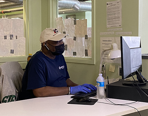 Staff at Catholic Charities of Onondaga County’s men’s shelter in Syracuse wear protective gloves and masks in accordance with New York state executive order. (Photo provided)