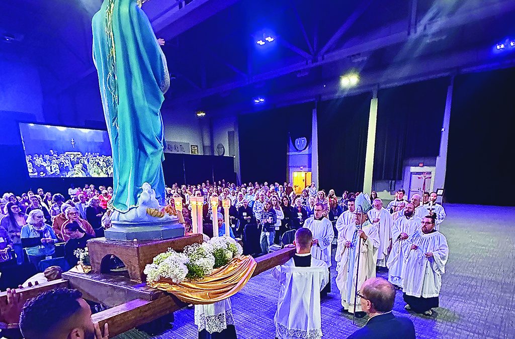 For the first time in the history of the Syracuse Catholic Women’s Conference, a Rosary procession with hundreds of faithful walking side-by-side in prayer was held following a Marian Mass celebrated by Bishop Douglas J. Lucia. Bishop also led the very reverent and sacred procession. Attended by about 630 women of all ages, the annual event took place Oct. 25 at the OnCenter in downtown Syracuse. This year’s theme: “Mother of Divine Hope.”